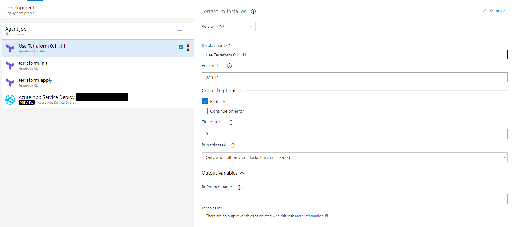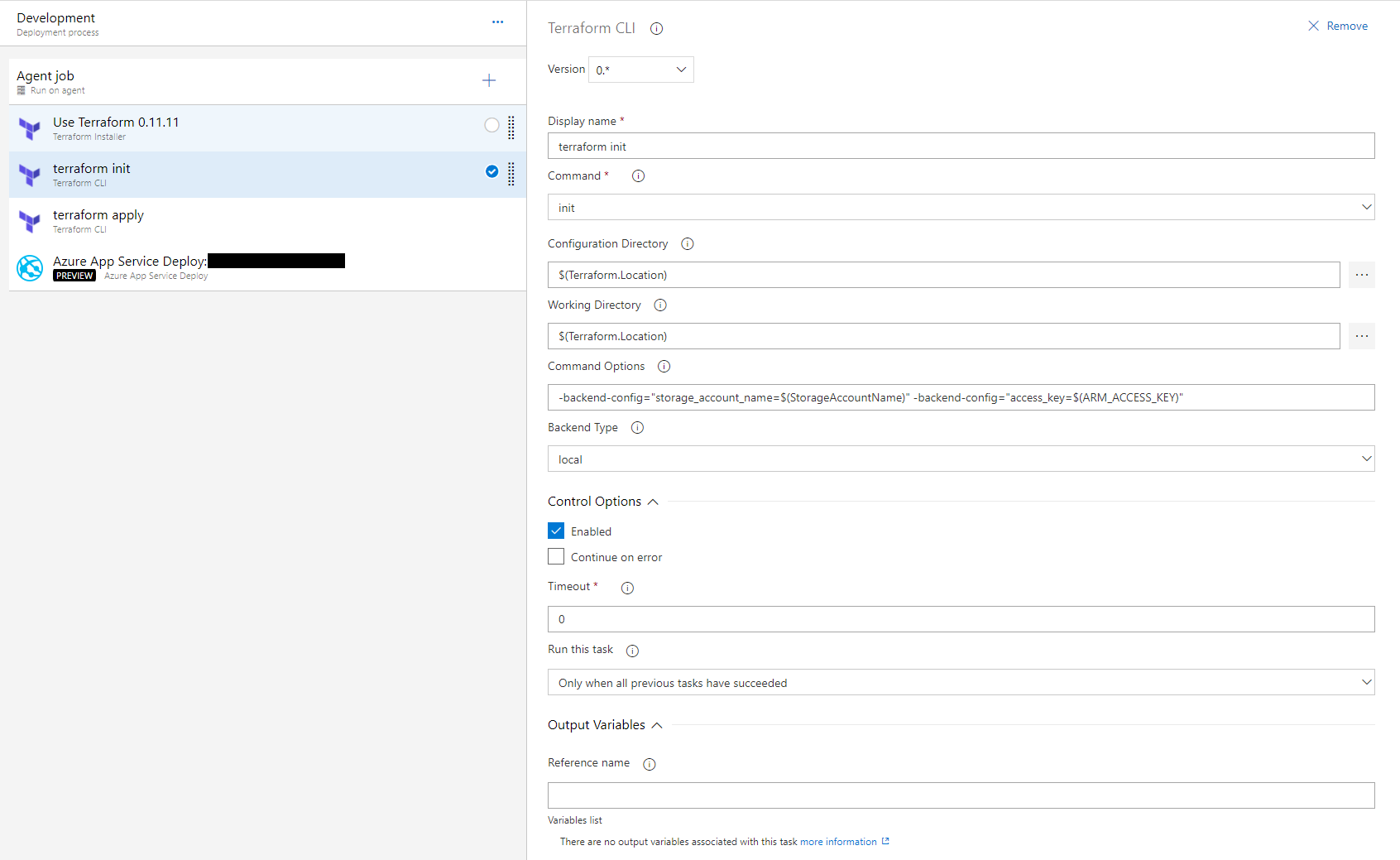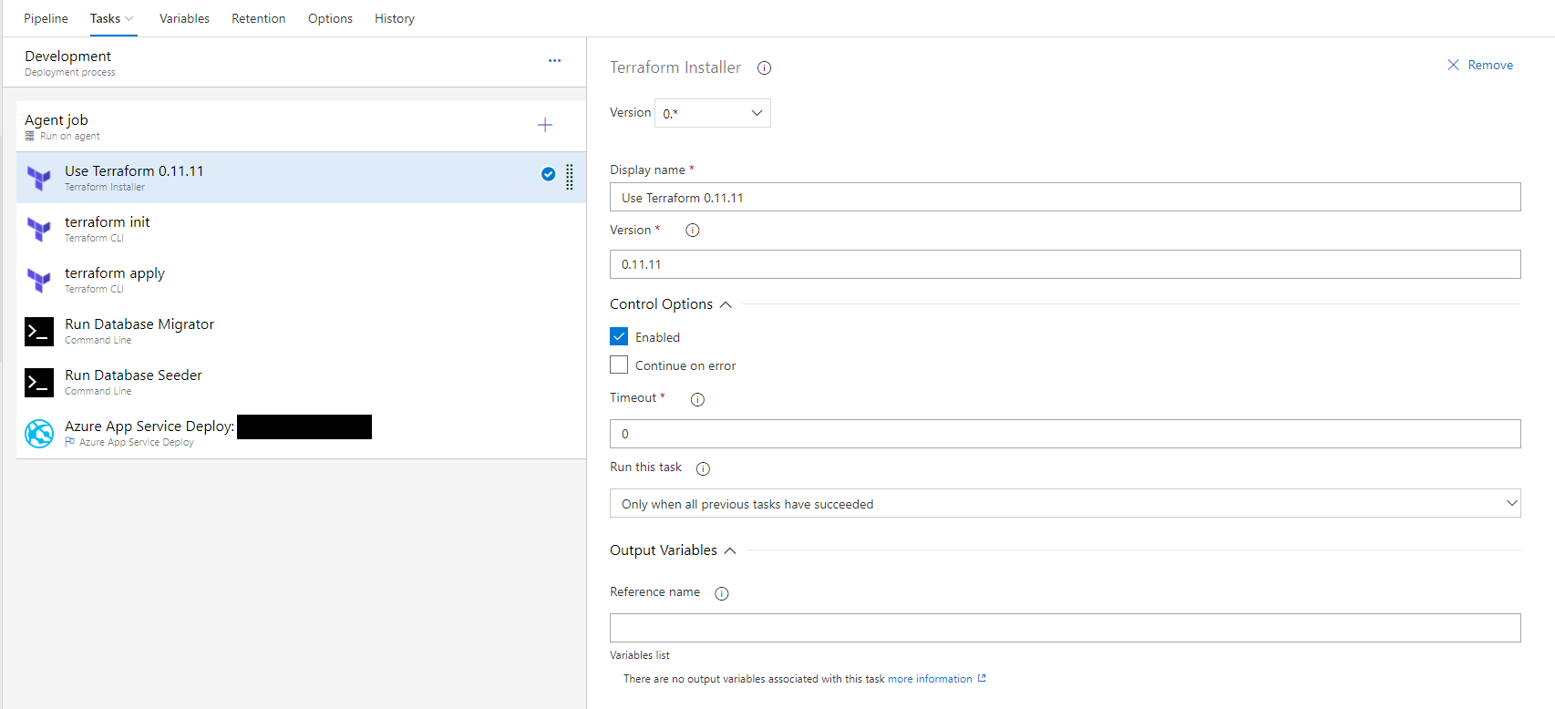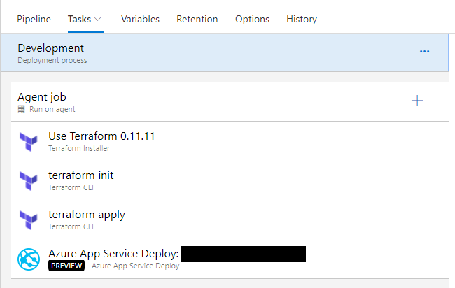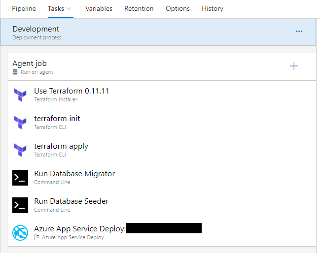 These tasks are relatively straightforward. Note that the Terraform tasks are added from the Marketplace.