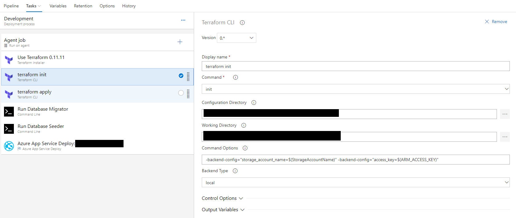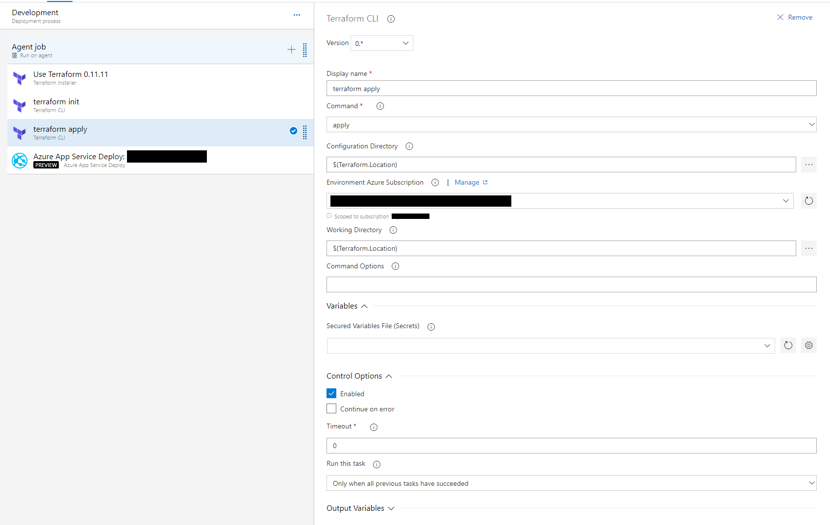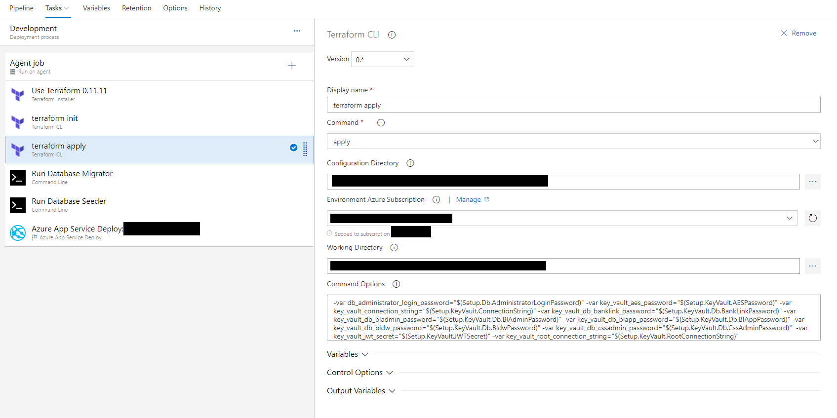 These tasks are relatively straightforward. Note that the Terraform tasks are added from the Marketplace.