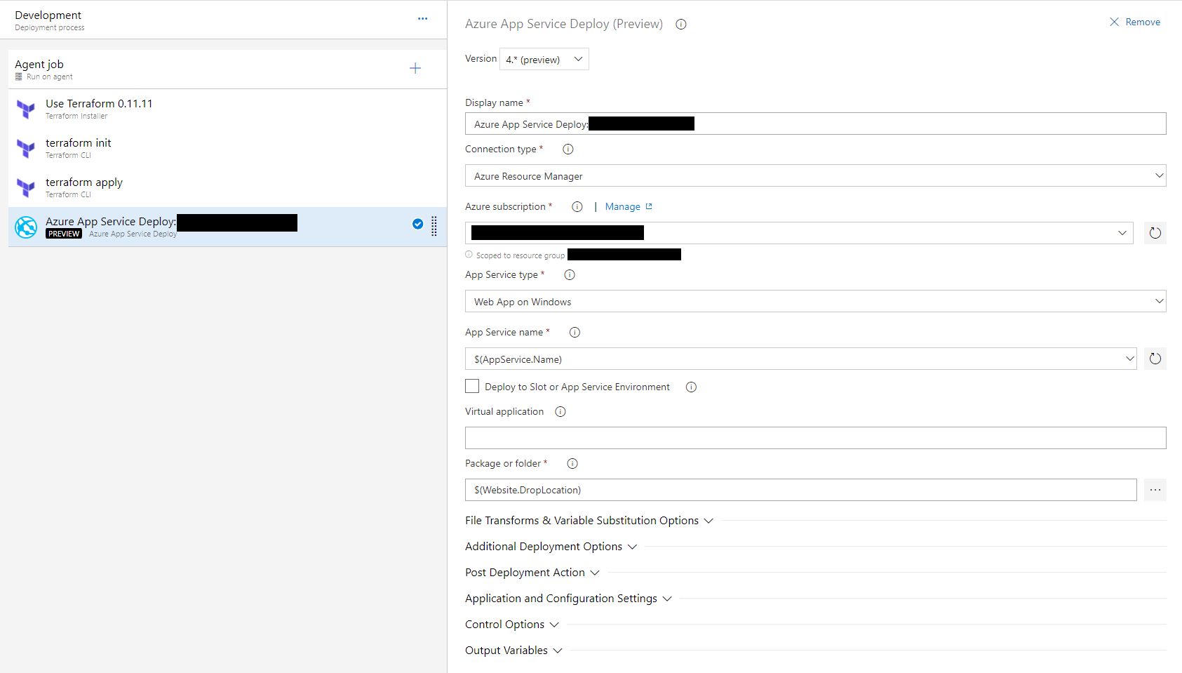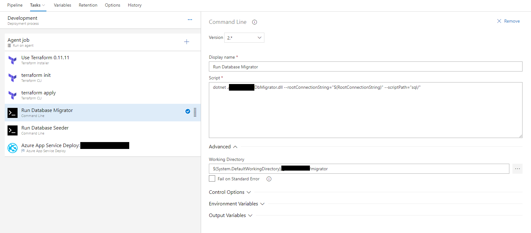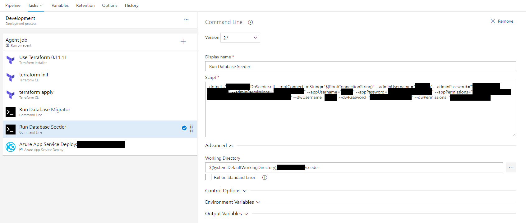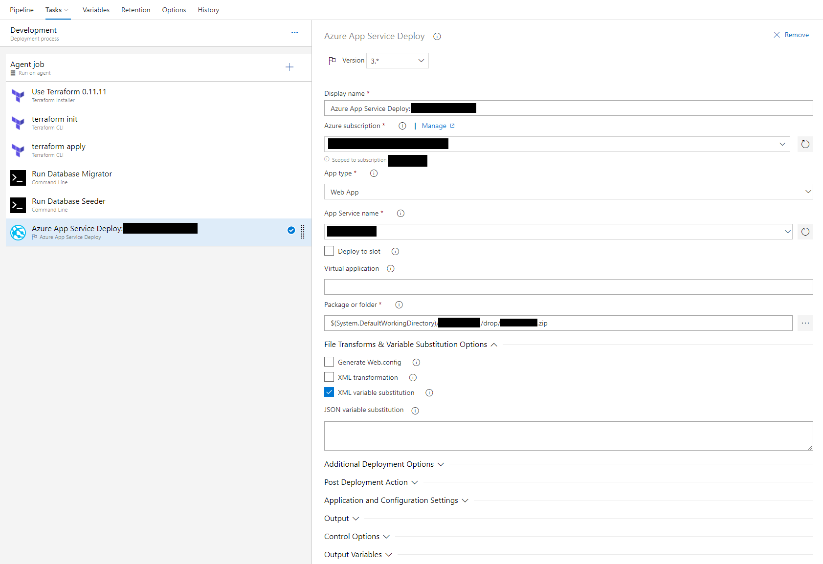 These tasks are relatively straightforward. Note that the Terraform tasks are added from the Marketplace.