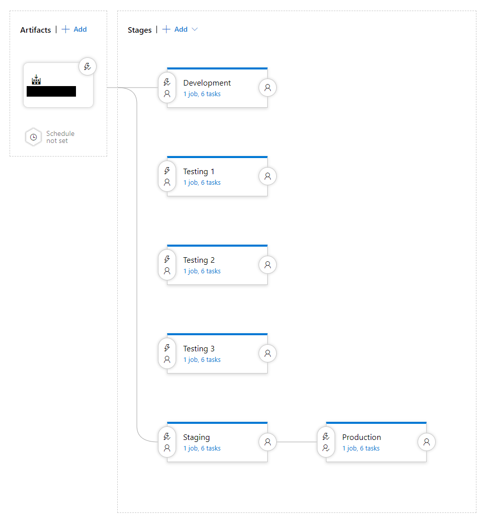 There exists a single Release Pipeline for the entire single-page application, each with a number of stages defined. Within each of these stages, a number of tasks are run.