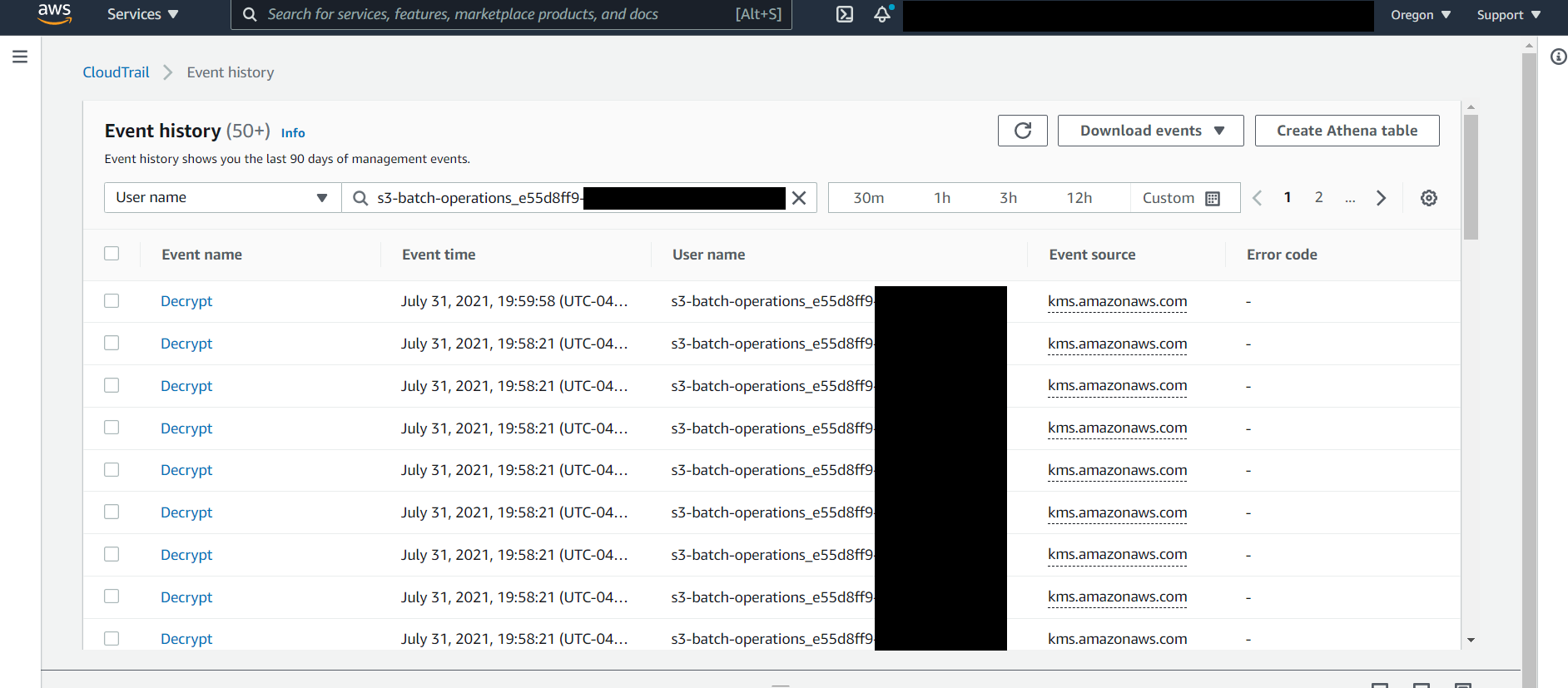 Next, shoot on over to CloudTrail and filter by User Name. The value you'll want to use is s3-batch-operations_{Job ID}, where {Job ID} is your S3 Batch Operation's Job ID retrieved in the previous step.